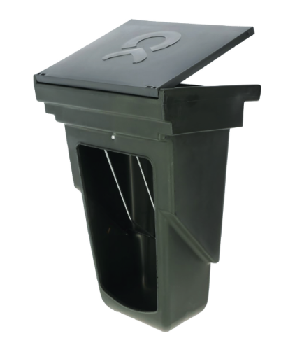 Foderautomaten rymmer 11,5 liter (330x512x270mm). Den kan hängas på insidan av våra förgårdar. Kan enkelt fyllas på från utsidan och har lock som skyddar mot regn.